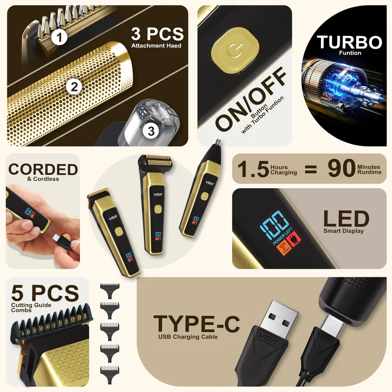 The VGR V-366 3-in-1 Professional Hair Trimmer is a high-performance grooming device engineered for precision cutting, extended runtime, and reliable operation. Designed for both home users and professional barbers, this model combines durable construction with advanced technical features.