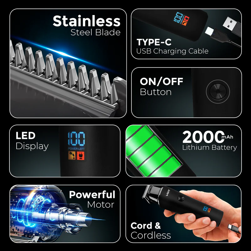 The VGR V-937 hair trimmer features high-quality stainless steel blades designed for smooth, even cuts. The sharp blade system provides clean trimming, sharp outlines, and efficient beard shaping without the pulling of hair or skin irritation.